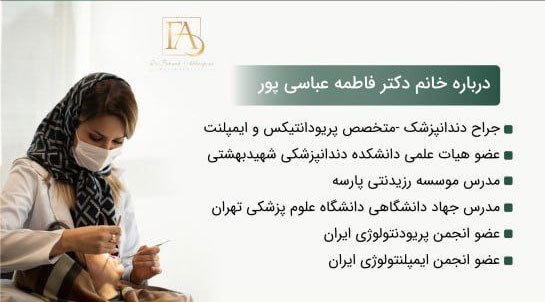 دکتر فاطمه عباسی پور “متخصص ایمپلنت های دندانی” و “دندانپزشکی زیبایی” در مطب تخصصی دندانپزشکی در ولنجک و شمال تهران با ارایه راهکارهای نوین دندانپزشکی